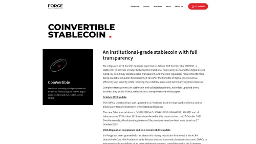 CoinVertible is a stablecoin initiative launched by Société Générale – FORGE (SG-FORGE), a subsidiary of the globally recognized financial services group, Société Générale. CoinVertible is designed to combine the stability of fiat currencies with the technological benefits of blockchain technology, thereby offering a reliable and transparent medium of exchange for various financial applications.